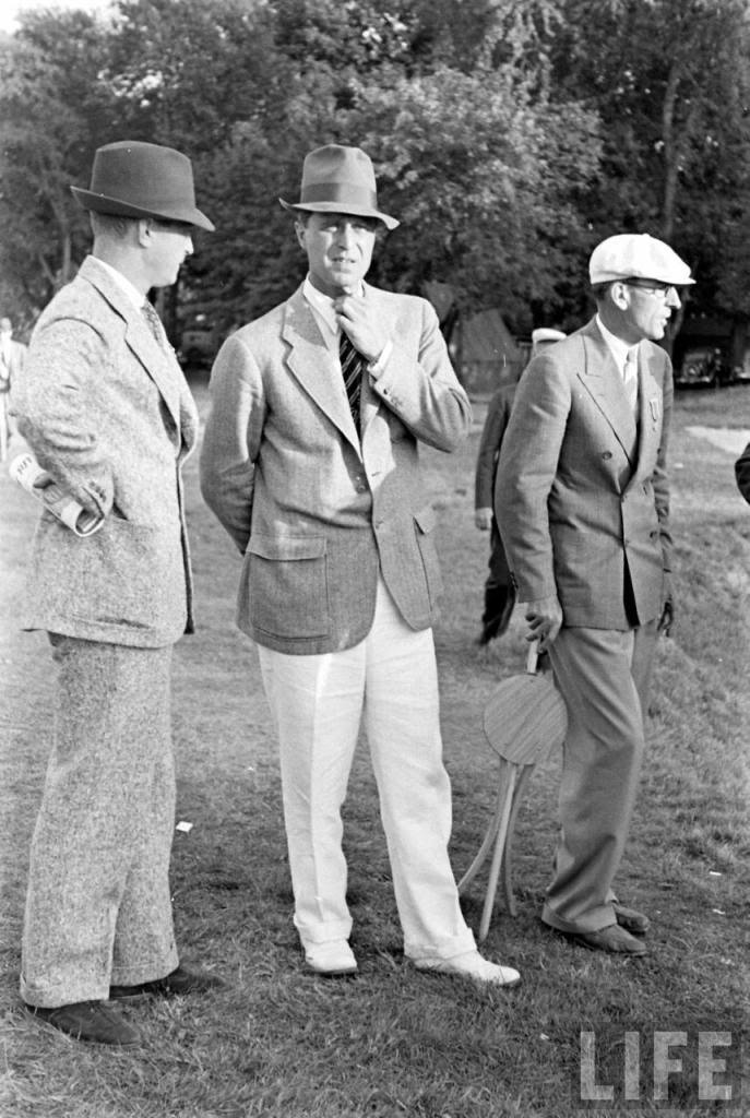 Luultavasti ajan hermolla, sillä ei tuo ollut ihan tavatonta noihin aikoihin, vaikkei takki toki noin ollut tarkoitettu napitettavan. (Kuvassa Prescott Bush.)